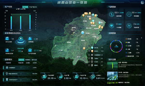 峨眉山茶始于西周,发乎于秦汉,盛名唐宋。近年来,峨眉山市国家农村产业融合发展示范园坚持以茶叶为主导产业,建设优质茶业基地,形成“园区+产业+旅游+文化”的茶产业模式。托普云农以峨眉山茶产业基地为依托,布设虫情、苗情、墒情、灾情监测智能装备,打造茶产业数字化平台,涵盖茶产业一张图、生产综合管理、市场行情监测等内容,打通从“茶园”到“茶杯”的全茶产业链,带动农户走出一条可复制的增收之路。