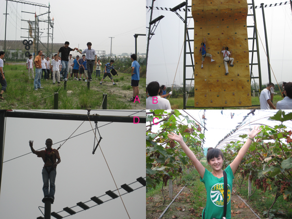 为了丰富我们的果园之行,同时也为了挑战和考验我们,公司特地挑选了几个拓展项目。其中图2中A为走钢丝,B为攀岩,C为大棚葡萄,D为高空跳杆。项目不多,但却让我们真正感受到了合作的可贵和敢于战胜自己,挑战极限的喜悦和满足。拓展活动的进行,考验的是一个公司的凝聚力、团队协作精神和战胜困难的信心。拓展活动,不仅仅是简单的体育加休闲,它体现的更多的是一个公司的精神面貌和面对困境时表现出的坚强与勇气。拓展训练是员工素质的全面提炼和综合补充,是员工间相互了解、相互合作、相互补充的纽带,它让我们把有限的知识技能释放出来,并深刻体会意志与精神的强大力量!期间最精彩的项目之一--高空跳杆,所有参与拓展的托普员工,都顺利的站上了那个预示成功的圆盘,然后实现转身、跳跃的完美过程。托普人的成功,也许正预示着托普的成功,我们充满信心!