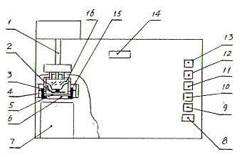 1.7 按动和面键(12)和洗涤键(11),托架(4)带动洗涤杯(2)下降,洗涤钩转动,开始和面显示器(14)后二位显示和面的时间(S)。当和面到达所设置的时间(20S)后,托架带动洗涤杯上升,水泵向洗涤杯内供水,开始洗涤面团,显示器前一位显示洗涤面团的时间(min),当洗涤到达所设置的时间(5min)后,仪器停止工作,完成洗涤。和面键(12)和洗涤键(12)也可分开使用,如和面结束后再按洗涤键,仪器开始洗涤。