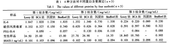 Ó°ÏìLowry·¨²â¶¨µ°°×µÄÖ÷ÒªÒòËØÓÐijЩ°±»ùËá¡¢NH ¡¢¼æÐÔÀë×Ó»º³åÒº¡¢·ÇÀë×Ó±íÃæ»îÐÔ¼Á¡¢ÕáÌÇ¡¢º¬Áò»¯ºÏÎӰÏìBCA·¨²âµ°°×µÄÖ÷ÒªÒòËØÓÐÕáÌÇ¡¢NH4+¡¢ÄòËØ¡¢EDTA_7 J£¬»Ç»ùË®ÑîËá³Áµí·¨ËäÈ»¿Ë·þÁËÒÔÉϸ÷ÖÖÒòËØ£¬µ«ÊDz»Í¬µÄµ°°×ËùÐγɵijÁµíÐÔÖʲî±ðºÜ´ó¡£Èç±¾ÊÔÑéËùÏÔʾ£¬ÓÃţѪÇå°×µ°°××÷±ê×¼²â¶¨ÆÆÉË·çÀà¶¾ËØºÍIL-6µ°°×º¬Á¿Îó²î¿É³¬¹ý100£¥ £¬ÇÒµ°°×Ũ¶ÈԽСÎó²îÔ½´ó£¬Òò´ËÓô˷¨²â¶¨µ°°×º¬Á¿Ê±Ó¦Ñ¡ÏàͬµÄ»òÐÔÖÊÏà½üµÄµ°°××ö±ê×¼¡£Ó°ÏìBradford·¨µÄÖ÷ÒªÒòËØÓиÊÓÍ¡¢ÒÒËᡢȥÎÛ¼ÁºÍһЩ¼îÐÔ»º³åϵͳ¡£ÓÉÓÚÓÃLowry·¨²â¶¨PEG-IL-6ʱ»á²úÉú»ÆÉ«³Áµí£¬²¢ÇÒѸËÙ³Áµíµ½¹Üµ×£¬ÎÞ·¨Ó÷ֹâ¹â¶È¼Æ²âµÃ¾ùÔȵÄÎü¹â¶È¡£ËùÒÔ£¬²â¶¨PEG-IL-6µÈPEG»¯µÄµ°°×Ũ¶Èʱ²»ÄܲÉÓÃLowry·¨£¬µ«¿ÉÒÔ²ÉÓÃBCA·¨¡£°üºÌåµÄ±äÐÔÒººÍ¸´ÐÔÒºÖо³£»áº¬ÓÐÄòËØºÍ¦Â£®ÛÏ»ùÒÒ´¼£¬ÕâЩÎïÖÊ»á¸ÉÈÅBCA·¨µÄ²â¶¨£¬ËùÒÔBCA·¨²»ÊÊÓÚº¬ÓÐÄòËØºÍ¦Â£®ÛÏ»ùÒÒ´¼µÄ±äÐÔÒºÖе°°×º¬Á¿µÄ²â¶¨¡£¸ù¾Ý±í1¿ÉÖª£¬»Ç»ùË®ÑîËá³Áµí·¨¶ÔÿÖÖÑùÆ·¼ì²âÆ«²î¶¼½Ï´ó£¬Òò´Ë£¬³Áµí·¨±ØÐëÓÃÓëÑùƷͬÖʵÄÒÑÖªµ°°×º¬Á¿µÄ¶ÔÕÕÆ·²â¶¨£¬Ò²²»ÊÊÓÚ¼ì²âPEG-IL-6ºÍ±äÐÔÒºµ°°×²â¶¨¡£Í¨¹ý±í2µÄ½á¹ûÏÔʾ£¬BCA·¨¼ì²âPEG-IL-6µÄ¸ÉÈÅÉÙÖØÏÖÐÔ¸ß(RSD<5£¥)£¬¶øBradford·¨¿ÉÒÔ²»ÊܱäÐÔÒºÖеϹÔÐÔÎïÖʸÉÈÅ£¬¶Ô°üºÌå±äÐÔÒºÖеĵ°°×Ũ¶ÈµÄ¼ì²â±È½Ï׼ȷ£¬ÇÒÖØÏÖÐÔºÃ(RSD<5£¥)¡£Òò´Ë£¬¶ÔÓÚPEG-IL-6µÈPEGÐÞÊκóµÄµ°°×Ũ¶È²â¶¨×îºÃ²ÉÓÃBCA·¨£¬¶ø¶ÔÓÚ°üºÌå±äÐÔÒºÕâÖÖº¬Óл¹ÔÐÔÎïÖʵÄÑùÆ·£¬Æäµ°°×Ũ¶È²â¶¨×îºÃ²ÉÓÃBradford·¨¡£