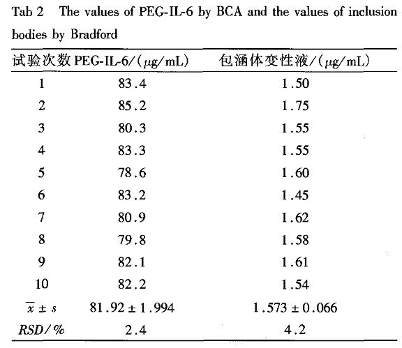 ¶ÔLowry·¨²âµÃµÄIL-6ÑùƷŨ¶ÈΪ250 ¦Ìg£¯mL£¬¼ÓÈëPEGÐÞÊκóÔÙÓÃBCA·¨²âµÃµÄ¸ÃÑùÆ·µÄŨ¶ÈΪ246 ¦Ìg£¯mL£¬ËµÃ÷PEG¶ÔBCA·¨Ã»ÓÐÓ°Ïì¡£¶ÔBCA·¨²â¶¨µÄ°üºÌå±äÐÔÒºÖе°°×Ũ¶ÈΪ25 mg£¯mLµÄÑùÆ·ÓÃBradford·¨²âµÃÖ»ÓÐ1£®59 mg£¯mL£¬¶ÔÕÕÊÔÑéÏÔʾ°üºÌå±äÐÔÒºÖеĦÂÒ»ÛÏ»ùÒÒ´¼ÑÏÖØ¸ÉÈÅBCA·¨£¬¶ø¶ÔBradford·¨ÎÞÓ°Ïì¡£Óɴ˿ɼû£¬Bradford·¨ÊÊÓÚ¼ì²â°üºÌå±äÐÔÒº¡£±í2ÊÇÁ¬Ðø10´Î¶ÔͬһPEG-IL-6ÑùÆ·ÓÃBCA·¨²â¶¨ºÍͬһ°üºÌå±äÐÔÒºÑùÆ·ÓÃBradford·¨²â¶¨µÄ½á¹û¡£