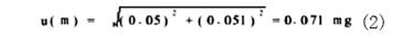 1.2 样品称量的标准不确定度u(m)的分析称量不确定度来自两方面。第一,称量的变动性在50g 以内,称量的变动性通过10次重复测定统计,标准偏差为0.05mg。第二,天平校正产生的不确定度,按检验证书给定的± 0.1mg,在置信概率95%(k=196)时,换算成标准偏差为:0.1/1.96=0.051,此两项得出称量的不确定度为:
