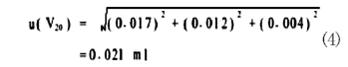 20mL 移液管的标准不确定度来源为:第一,移液管体积的不确定度,按检验证书给定为± 0.03mL,按均匀分布换算标准偏差为0.03/ √ 3=0.017mL;第二,充满液体至移液管刻度的变动性,通过重复6次测定统计,标准偏差为0.012mL;第三,移液管和溶液的温度与校正时的温度不同引起的体积不确定度,假设差为2℃,对水体积膨胀系数为2.1 × 10-4/℃,则95% 置信概率(k=1.96)时体积变化的区间为± 20 × 2 × 2.1 × 10-4= ± 0.008mL,转换成标准偏差为0.008/1.96=0.004mL,以上三项合成得出的不确定度为:
