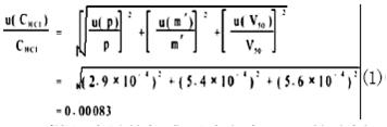 用盐酸标准溶液滴定样品和试剂空白是在10mL 滴定管中进行的。10mL 滴定管的标准不确定度来源为:第一,滴定管体积的不确定度,按检定证书给定为± 0.02mL,按均匀分布换算成标准偏差为0.02/ √ 3=0.012mL。第二,充满液体至滴定管刻度的变动性,通过重复6 次测定统计, 标准偏差为0 . 0 1 0m L 。第三,滴定管和溶液的温度与校正温度不同引起的体积变化的不确定度,假设差为2℃,对水体积膨胀系数为2.1 × 10-4/℃,则95% 置信概率(k=1.96)时体积变化的区间为± 10 × 2 × 2.1 × 10-4=0.004mL,换算成标准偏差为0.004/1.96=0.002mL,以上三项合成得出的不确定度为: