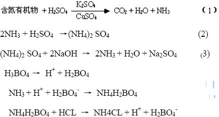 反应(1)(2)在凯氏烧瓶内完成,反应(3)在凯氏蒸馏装置中进行,其特点是将蒸汽发生器、蒸馏器及冷凝器三个部分融为一体。由于蒸汽发生器体积小,节省能源,本仪器使用方便,效果良好。硫酸铵与浓碱作用可游离出氨,借水蒸气将产生的氨蒸馏到一定浓度的硼酸溶液中,硼酸吸收氨后使溶液中的H+浓度降低,然后用标准无机酸滴定,直至恢复溶液中原来H+浓度为止,最后根据所用标准酸的量计算出待测物中总氮量。