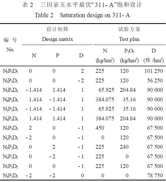 ¹©ÊÔÆ·ÖÖΪÇàÖüÓñÃׯ·ÖÖ½ðÀ¤9 ºÅ¡£ÊÔÑéÉè¼ÆÎªÊ©µªÁ¿(´¿N)¡¢Ê©Á×Á¿(P2O5)¡¢ÖÖÖ²ÃܶÈ(D)3 ¸öÒòËØ¡¢5 ¸öˮƽ, ²ÉÓÃ311- A ±¥ºÍÉè¼Æ, 12 ¸ö´¦Àí×éºÏ(±í1, ±í2), ÖØ¸´3 ´Î, ¹²36 ¸öÊÔÑéÐ¡Çø, Ã¿Ð¡ÇøÃæ»ýΪ15 m2, Ðоà50 cm¡£²¥ÖÖÆÚΪ4 ÔÂ28 ÈÕ, ²¥ÖÖǰʩÓлú·Ê22 500 kg/hm2, Á׷ʰ´´¦Àíˮƽ×÷Ϊµ×·ÊËæ²¥ÖÖÒ»´ÎÐÔÊ©Èë, ÄòËØ·Ö±ðÔÚСÀ®°È¿ÚÆÚºÍ´óÀ®°È¿ÚÆÚ°´Ê©·Ê×ÜÁ¿µÄ30%ºÍ70%×·Ê©, ÉúÓýÆÚ¼ä½áºÏ×··Ê¹àË®3 ´Î, ÆäËü¹ÜÀí´ëʩͬÆÕͨÓñÃ×´óÌï¡£
