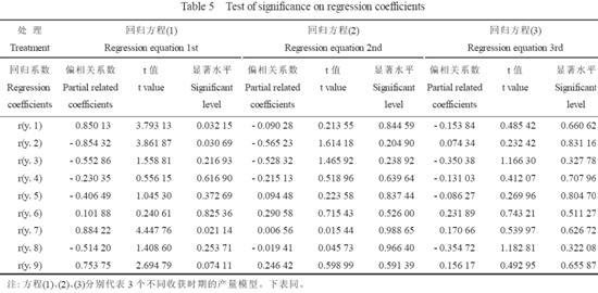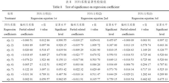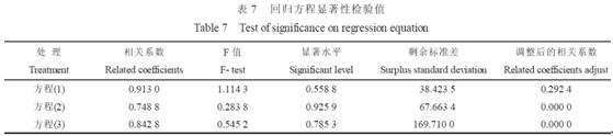 ¶Ô²»Í¬ÊÕ»ñÆÚÖ²Öê´ÖÖ¬·¾²úÁ¿½á¹û½øÐжþ´Î»Ø¹éÄâºÏ(±í6¡¢±í7)½á¹û±íÃ÷, »Ø¹é·½³Ì¼ìÑéÖµÓë»Ø¹éϵÊý¼ìÑéֵδÍêÈ«´ïµ½ÏÔÖøË®Æ½, ±íÃ÷Ó°Ïì´ÖÖ¬·¾²úÁ¿µÄ3 Òò×ÓÖÐ, ¸ö±ðÒò×ÓÓë´ÖÖ¬·¾²úÁ¿Ïà¹Ø²»ÏÔÖø¡£8 ÔÂ11 ÈÕÊÕ»ñ, N¡¢Ãܶȵ¥Òò×ÓÓë´ÖÖ¬·¾²úÁ¿Ïà¹Ø²»ÏÔÖø; P ÃܶȻ¥×÷Óë´ÖÖ¬·¾²úÁ¿Ïà¹Ø²»ÏÔÖø¡£8 ÔÂ26 ÈÕÊÕ»ñ, P Óë´ÖÖ¬·¾²úÁ¿Ïà¹Ø²»ÏÔÖø; N ÃܶȻ¥×÷¡¢P ÃܶȻ¥×÷Óë´ÖÖ¬·¾²úÁ¿Ïà¹Ø²»ÏÔÖø¡£9 ÔÂ12ÈÕÊÕ»ñ, N¡¢P µ¥Òò×ÓÓë´ÖÖ¬·¾²úÁ¿Ïà¹Ø²»ÏÔÖø; P ÃܶȻ¥×÷Óë´ÖÖ¬·¾²úÁ¿Ïà¹Ø²»ÏÔÖø¡£