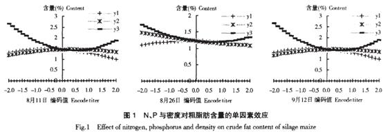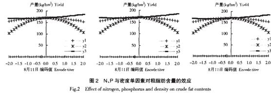 ÓÉͼ1 ¿É¼û, ÔÚ3 ¸öʱÆÚÊÕ»ñ, N¡¢P ÓëÖÖÖ²Ãܶȵ¥Òò×Ó¶Ô´ÖÖ¬·¾º¬Á¿µÄЧӦÒòÊÕ»ñÆÚ²»Í¬¶øÒ졣ɢ·ÛÆÚÊÕ»ñ, ËæÊ©N Á¿µÄÔö¼Ó, ´ÖÖ¬·¾º¬Á¿³ÊÔö¼ÓÇ÷ÊÆ, Ôö¼Ó·ù¶È½¥»º; ËæÊ©P Á¿µÄÔö¼Ó, ³ÊϽµÇ÷ÊÆ, ¶øÇÒÊ©P Á¿Ô½´ó, ϽµÔ½ÏÔÖø; ´ËÆÚÊÕ»ñ, ÃܶȶԴÖÖ¬·¾º¬Á¿µÄЧӦ×îС, ÇÒËæÃܶȵÄÔö´ó, ´ÖÖ¬·¾º¬Á¿³ÊϽµÇ÷ÊÆ, Ͻµ·ù¶È½¥»º¡£¹à½¬ÆÚºÍÈéÊìÆÚÊÕ»ñ, Ëæ×ÅÊ©N Á¿µÄÔö¼Ó, ´ÖÖ¬·¾º¬Á¿³Ê¡°µ¥·å¡±ÇúÏ߱仯¡£·åÖµ·Ö±ðΪ1.23%ºÍ1.47%, ¶ÔÓ¦N µÄ×î¼ÑÊ©ÈëÁ¿Îª210 kg/hm2 ºÍ165kg/hm2¡£¹à½¬ÆÚÊÕ»ñ, ËæÊ©P Á¿µÄÔö¼Ó, ´ÖÖ¬·¾º¬Á¿³ÊϽµÇ÷ÊÆ, Ͻµ·ù¶È½¥»º; ÈéÊìÆÚÊÕ»ñ, ËæÊ©P Á¿µÄÔö¼Ó, ´ÖÖ¬·¾º¬Á¿³Ê¡°µ¥·å¡±ÇúÏ߱仯, ·åֵΪ1.46%, ¶ÔÓ¦µØ×î¼ÑÊ©P Á¿Îª144 kg/hm2¡£¹à½¬ÆÚºÍÈéÊìÆÚÊÕ»ñ, ´ÖÖ¬·¾º¬Á¿ËæÃܶÈÔö´ó³Ê¡°U¡±ÐÍÇúÏ߱仯¡£