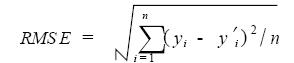 Óɵ¥±äÁ¿ºÍ¶à±äÁ¿»Ø¹éÄ£Ð͹À¼Æ³öµÄ²ÎÊý,Æä¾«¶È¿ÉÓþù·½¸ù²îÀ´ÆÀ¼Û¡£Ê½ÖÐ, yi ºÍy¡äi ·Ö±ðΪʵ²âÖµºÍÀíÂÛÖµ, nΪÑù±¾Êý¡£RMSE ֵԽС˵Ã÷·½³ÌµÄ¾«¶ÈÔ½¸ß¡£