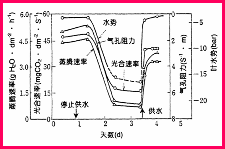 当土壤水分不足,蒸发作用过于旺盛:无法将作物所需的元素正常的运输到植物需要的地方,比如幼果以及幼苗,是植物不能正常的生长。同时水分不足还影响着植物的有机物质即光合作用的正常进行。水分亏缺会使光合速率下降。在水分轻度亏缺时,供水后尚能使光合能力恢复,倘若水分亏缺严重,供水后叶片水势虽可恢复至原来水平,但光合速率却难以恢复至原有程度,下图就是土壤水分缺损以及修复水分过程中,植物光合作用以及其他的一些生理反应的过程: