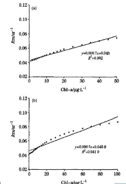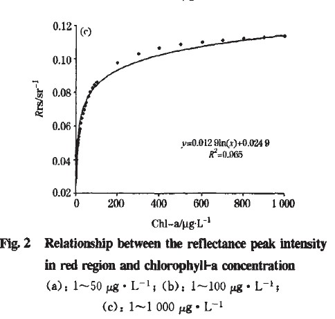 由图2(a)可知,叶绿素在红波段的反射峰强度同浓度有较好的线件相关性,其决定系数达0.982,利用叶绿素浓度同反射峰强度的相关关系,进行叶绿素浓度的反演,有较好的反演效果,其RMSE为1.944 ug·L-1。但是当叶绿素浓度达到10ug·L-1时,这种线性相关关系逐渐减弱[图2(b)],当叶绿素浓度达到l 000ug·L-1时,红波段反射峰强度和叶绿素浓度则呈现较好的对数关系[图2(c)],决定系数达0.965。
