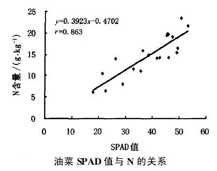 油菜叶片的SPAD值和N含量呈线性关系,拟合后r为0·862,则SPAD值与N的数学关系模型可用以下式子来表示:y=0.3923x-0.4702