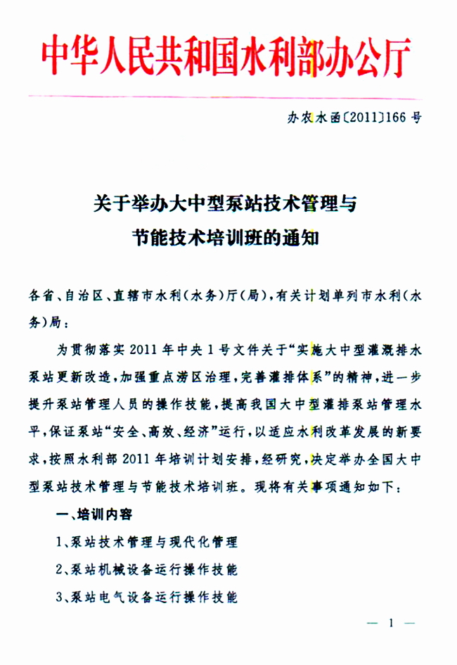 关于举办大中型泵站技术管理与节能技术培训班的通知