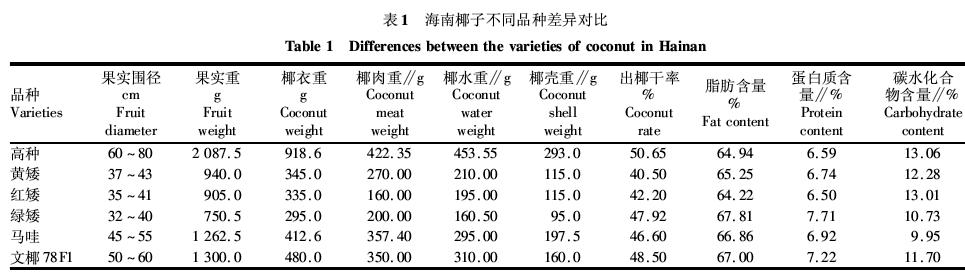椰子种质资源的特性是决定其开发价值的主要因素,因此科研人员针对海南椰子,选取了海南高种、马哇、文椰78F1、黄矮、绿矮和红矮6个品种作为分析对象。通过分析其特性,总结出了它们之间的差异性和稳定性。其中各类品种的椰子都能够从种质资源库得到。