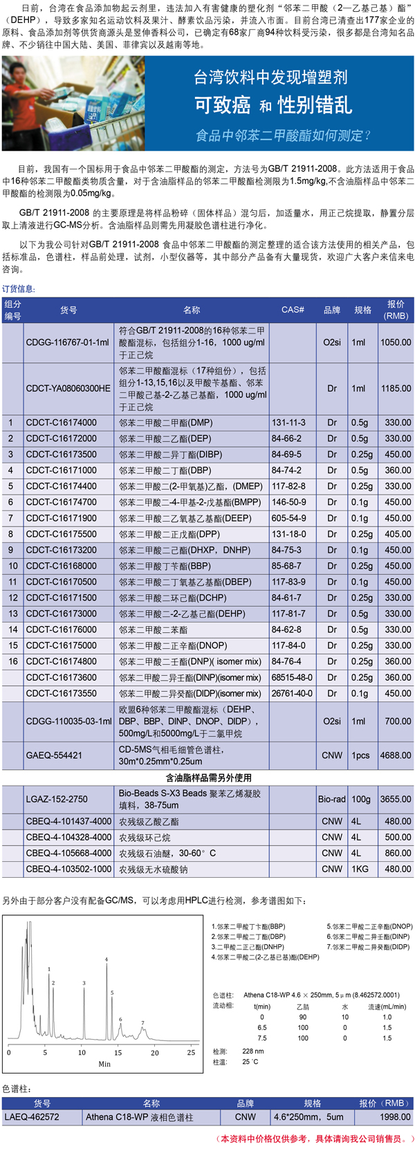 食品饮料中塑化剂的检测方法及配套耗材
