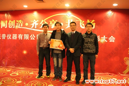 托普仪器各领导整体汇报工作全部结束后,托普仪器陈渝阳总经理科学适度地评价过去的一年是稳步发展的一年,对各生产车间和职能管理部门勤勤恳恳、兢兢业业的工作态度和心系公司、无私奉献的敬业精神给予了充分肯定,准确地指出了工作中存在的问题,并指出我们要以此为动力,继续提倡执着敬业、真抓实干、团结协作、同心同德的精神,用实际行动为公司进步添砖加瓦。并且公司总经理、各分管副总为浙江托普仪器年度优秀新人、优秀员工、优秀主管、总经理特别奖(金蝶改进小组)、物流小组等获奖人员进行表彰并为托普精英们颁发证书和奖金并合影留念。