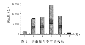 ͼ1½á¹ûÏÔʾ,ÓÕ³æÁ¿ÒÔ7ÔÂ×î¶à,8Ô´ÎÖ®¡£Ò²¾ÍÊÇ˵,Ïà±ÈÖ®ÏÂ,7¡¢8Ô·ÝÊÇ´ó¶àÊýÀ¥³æµÄ³É³æ¸ß·åÆÚ¡£Í¬Ê±,¸ÃµÆ¿ÉÒÔ²â³öÌØ¶¨³æµÄ·åÆÚ,ÒÀ´ÎÖÆ¶¨·ÀÖζԲߡ£
