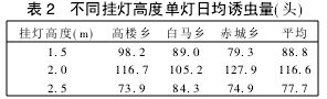 ¸ù¾Ý3µã3×éͳ¼ÆÏÔʾ(±í2),ƵÕñʽɱ³æµÆ1.5 m¸ß¶Èµ¥µÆÈÕ¾ùÓÕ³æÁ¿Îª88.8Í·,2m¸ß¶Èµ¥µÆÈÕ¾ùÓÕ³æÁ¿Îª116.6Í·,2.5 m¸ß¶Èµ¥µÆÈÕ¾ùÓÕ³æÁ¿Îª77.7Í·,¹ÒµÆ¸ß¶ÈÒÔ2 mΪ×î¼Ñ¡£