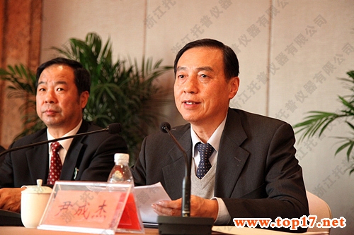 图为:全国人大农业与农村委员会副主任委员、中国农技推广协会会长尹成杰在会上发表讲话