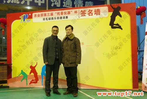 2013年元旦期间,农业部第三届“托普仪器”杯羽毛球俱乐部邀请赛在北京贝特羽毛球馆如期举行。托普仪器精心准备签名墙,农业部党组成员张玉香、部直属机关党委常务副书记胡元坤、全国农技中心陈生斗主任、杭大鹏书记与参赛人员纷纷签名留念。