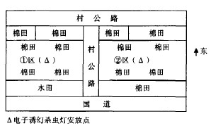 在邹城街龙桥村选择地势平坦、水源方便、土壤肥力好、交通便利的连片棉田二处,面积共13.33hm²,每处6. 67hm²,将16瓦灯管各12瓦灯管的两盏电源诱幻杀虫灯分别悬吊放于这两处棉田内,吊装16瓦灯的6. 67hm²棉田简称1区,吊装12瓦的灯的6. 67hm²棉田简称2区,每盏幻灯离地1.5m,灯距50m,开展诱杀害虫实验,详见幻灯安装及实验分区位置图。