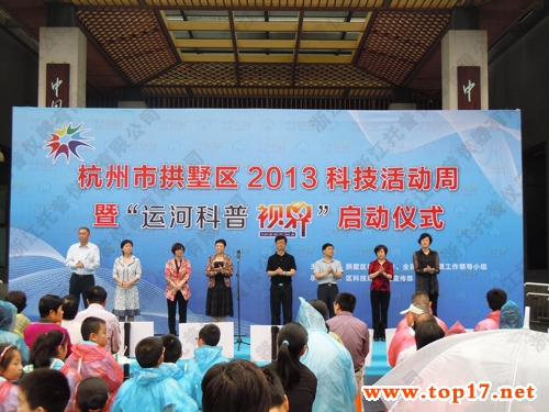 2013年5月17日上午,拱墅区2013年科技活动周暨“运河科普视界”活动启动仪式在小河路中国杭州刀剪剑博物馆广场隆重举行。此次科技活动周主题为“科技推动创新 建设幸福拱墅”。杭州市科协主席邬丽娜、杭州市科委副巡视员徐植、浙江省科协科普部副部长姜晓东、拱墅区四套班子领导、市科委、市科协、浙大城市学院、浙江树人大学等领导应邀出席开幕式。区各相关机关单位、职能部门、街道科协、区属学(协)会、辖区高校、高新技术企业代表、社区居民等500多人参加开幕式,共同启动了2013年拱墅区科技活动周暨“运河科普视界”活动。