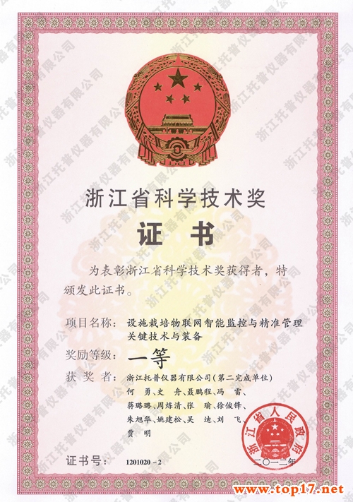 为了鼓励科学技术创新,促进科学技术进步和社会经济发展,根据《浙江省科学技术奖励办法》,托普仪器的科研项目——《设施栽培物联网智能监控与精准管理关键技术与装备》,经过省科学技术评审委员会审定,被评为2012年度浙江省科学技术奖一等奖。