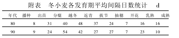 通常以每年第一次5日平均气温<0e的最后一天定为越冬开始期;或冬季气温常年在0e左右摆动的地区,以小麦植株高度变化而定。通过对驻马店市历年逐日平均气温统计分析发现:20世纪80年代以前,12月下旬至2月的大部分间里5日平均气温都在0e以下或在0e左右摆动。90年代以后,气温已发生明显变化,12月及2月下旬5日平均气温<0e日数基本消除,1月~2月中旬也只有在个别年份的个别时段内5日平均气温<0e,其它时段都在0e以上;从生长高度来看,越冬期内,植株并没停止生长,而是有微弱的上升。因此近几年来,在本区越冬开始期已很难确定。根据作物观测,20世纪80年代越冬日期平均在1月2日,90年代以后越冬日期平均在1月8日,越冬期明显滞后,尤其是2001~2002年度竟无越冬现象。由附表也可看出,90年代以后分蘖期延长,返青期提前,越冬期相对缩短。种种迹象表明,随着气候的逐渐增暖,本区冬小麦已没有明显的越冬期。