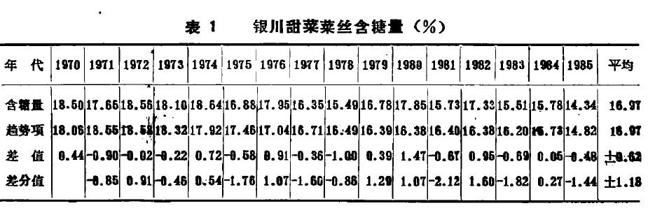 菜丝含糖量的年际变化从银川糖厂1970~1985年菜丝含糖量的资料看,有两个特点:是利用正交多项式,计算含糖量的趋势变化(见表1)有个连续下降的趋势。含搪量1970~1976年在17%以上,1977~1953年下降到16%,1954年下降到16%以下,1985年下降到15%以下。从1978年的18.50%到1985年的14.34%,含塘量前后共下降了4.16%。这种下降趋势,主要反映了甜菜品种的退化和生产管理水平的降低,如大量施用氮肥,以及甜菜面积的不断扩大。二是年际间还出现了高低变化。这种变化很大程度上是因为气象条件的变化所引起的,因此称这个变量为气候含糟里,从表1可见,除1978年外,般表现为高低约两年周期。