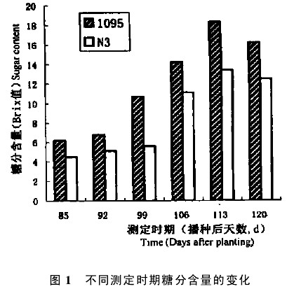 2.2 不同节间糖分含量的变化 就高糖系1095而言,一共7个节间,6个测定时期中的4个时期糖分含量最高值出现在第?节间,2个时期是第?节间的含糖量最高(表1)。就低糖系N3来说,情况与高糖系1095相比,略有不同。亲本N3共有6个节间,6个测定时期中的4个时期是第?节间含糖量最高,g个时期(106 d)是第?节间含糖量最高,另一个时期(99 d)是第?节间含糖量最高。据此,作者认为高粱茎秆中糖分含量最高的节间应该是中部节间或上一节间,这将给准确测定高粱茎秆中糖分含量提供理论依据。