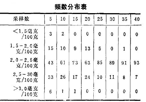 因为平均是2.345毫克/百克土,可以认为在2.0一2.5毫克/百克土间近似平均值范围,在此范围内出现频数越多,其采样伐表性越好。假设,每次只采五点混合样品进行分析,在一百次中,仅有43次可能接近平均值,有9次机会不是高于3.0毫克/百克土,或者低于1.5毫克/百克土。