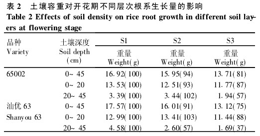 土壤容重对深层根(20~45cm)生长的影响大于表层根(0~20cm).以土壤容重112g#cm-3为100%,当土壤容重为114g#cm-3时,65002和汕优63表层根分别为93%和103%,深层根分别为102%和57%.当土壤容重为116g#cm-3时,65002和汕优63表层根分别为87%和88%,而深层根分为57%和37%.因此,当土壤容重提高时,深层根系重量下降更大,深层根系重量占根系总量比例下降.