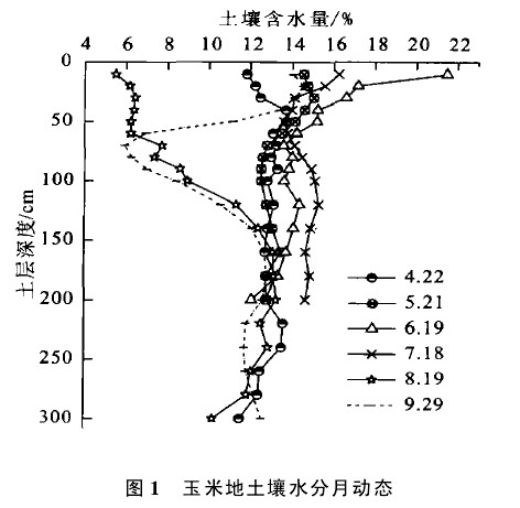 ¡¡¡¡¸ù¾Ýʵ²â×ÊÁÏ,»æÖƳöÊÔÑéÄê·ÝÓñÃ×Éú³¤½×¶ÎÍÁÈÀʪ¶ÈÆÊÃæ±ä»¯½ø³Ì¡£Í¼1ÖеÄ6ÌõÍÁÈÀʪ¶ÈÇúÏß,´ú±í²»Í¬Ô·ݵÄ6´Î²â¶¨¡£¿ÉÒÔ¿´³ö,³ý)5cmÉîµÄÍÁÈÀË®·ÖÓÉÓÚÊܵرí¸ÉʪӰÏì½Ï´ó,±ä»¯¶àÑù,5)16cmÍÁ²ãÖ®¼äµÄ6ÌõÍÁÈÀº¬Ë®Á¿ÇúÏ߿ɴóÖ·ÖΪ3×é,4,5Ô·ݾÓÖÐ,6,7Ô·ÝÔÚÓÒ,8,9Ô·ÝÔÚ×ó¡£Õâ±íÃ÷ÊÔÑéÄê·ÝÓñÃ×ÔÚÉú³¤³õÆÚ,ÍÁÈÀº¬Ë®Á¿½ÏµÍ;µ«ÊÇËæ×ÅÓê¼¾µÄÀ´ÁÙ,ÆäÍÁÈÀº¬Ë®Á¿¿ªÊ¼ÉÏÉý;¶øÔÚ×÷ÎïÉú³¤ºóÆÚ,ÓÉÓÚÓêË®µÄÏ¡ÉÙÒÔ¼°³ÖÐøÇ¿ÁҵĺÄË®×÷ÓÃʹÍÁÈÀË®·Öº¬Á¿½µµ½ÄêÄÚµÄ×îµÍÖµ¡£16cmÒÔϲ»Í¬Ê±¼äÍÁÈÀʪ¶ÈÏß´óÖ½ӽü,ÕâÒ²±íÃ÷¸ÃÄê¶ÈÓñÃ×µØÓÉʽ(1)¼ÆËã$Wʱ,ËùÈ¡Éî¶È¿ÉСÓÚ3m,Æ©Èç˵2m¡£