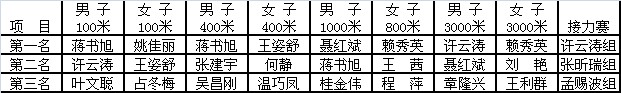 ´Ë´ÎÌï¾¶Ô˶¯»á·ÖΪÄÐ×Ó100Ãס¢Å®×Ó100Ã×£»ÄÐ×Ó400Ã×£¬Å®×Ó400Ã×£»ÄÐ×Ó1000Ã×£¬Å®×Ó800Ã×£»ÄÐ×Ó3000Ã×£¬Å®×Ó3000Ã×£»ÄÐÅ®»ìºÏ4*200Ã×½ÓÁ¦Èü¡£ÈüÖÆÎª£¬³õÈüÈ¡£¨Ã¿×éȡǰÁ½ÃûºÍ³É¼¨×îºÃµÄÁ½Ãû¹²ÁùÃûÈËÔ±½øÈë¾öÈü£©Ç°ÈýÃû½øÈë¾öÈü£¬¾öÈüȡǰÈýÃûΪ»ñ½±Ñ¡ÊÖ¡£ÉÏÎç9£º10£¬Ô˶¯»áÔÚÅ®×Ó400Ã׳õÈüÖÐÀ¿ªá¡Ä»¡£