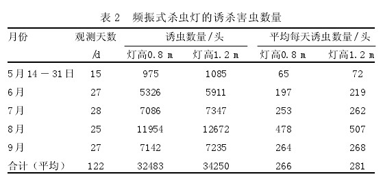 ¡¡¡¡2.ÓÕɱº¦³æÊýÁ¿´óʾ·¶Çø¹Ì¶¨2յɱ³æµÆ£¬1ÕµµÆ¸ß0.8m£¬1ÕµµÆ¸ß1.2m£¬´Ó5ÔÂ14ÈÕ£­9ÔÂ30ÈÕÀúʱ139d£¬ÆäÖÐÏÂÓêÈÕ14d£¬Í£µç¹ÊÕÏ3d£¬Êµ¼Ê¼ÇÔØÌìÊý122d¡£±í2¿É¼û£¬µ¥µÆ×î¸ßÿÌì¿ÉÓÕɱº¦³æ507Í·£¬Æ½¾ù273Í·¡£