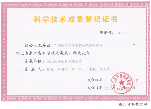 热烈祝贺托普便携式多通道农药残留检测仪获得科学技术成果登记证书
