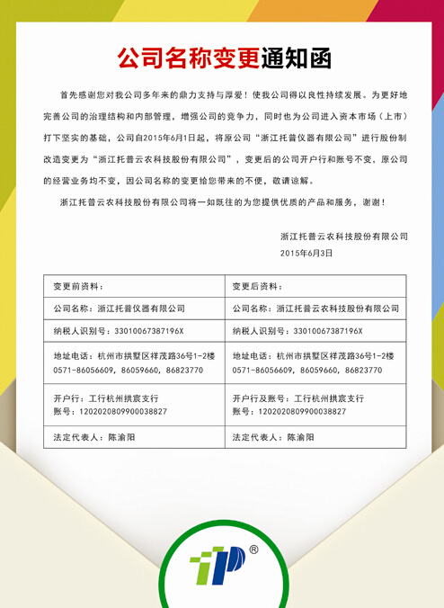 ΪÁ˸üºÃµØÊÊÓ¦¹«Ë¾·¢Õ¹Õ½ÂÔÐèÒª£¬¸üÈ«Ãæ¡¢¸ü׼ȷµØ·´Ó³ºÍÍ»³ö¹«Ë¾Ä¿Ç°µÄÐÐÒµÌØµã£¬ÈÕǰ£¬Õã½­ÍÐÆÕ˳ÀûÍê³ÉÁ˹ɷÝÖÆ¸ÄÔ죬¹«Ë¾ÓÉÔ­À´µÄ¡°Õã½­ÍÐÆÕÒÇÆ÷ÓÐÏÞ¹«Ë¾¡±¸üÃûΪ¡°Õã½­ÍÐÆÕÔÆÅ©¿Æ¼¼¹É·ÝÓÐÏÞ¹«Ë¾¡±£¬×Ô´ËÏÆ¿ªÁËÍÐÆÕ·¢Õ¹ÐÂÆªÕ£¡Å©ÒµÉú²ú¾«Ï¸»¯£¬¹æÄ£»¯¡¢²Ù×÷»úе»¯¡¢×÷Òµ±ê×¼»¯¡¢¹ÜÀíÐÅÏ¢»¯½«×÷ΪũҵÏÖ´ú»¯µÄÓÐÁ¦Ö§³Å£¬Î´À´±Ø½«ÒÔ¹¤Òµ»¯µÄ˼·À´·¢Õ¹ÏÖ´úũҵ¡£