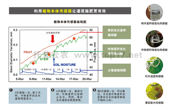 植物本体传感器,能实时或阶段性地监测植物茎秆粗细的变化、叶面的温度、茎流速率、果实增重与膨大速率、植物的光合作用等植物本身的一些参数,能直观地反应植物的生长状态。