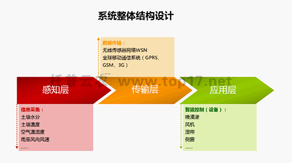 ¶ÔÓÚ¹æÄ£»¯µÄÎÂÊÒ´óÅïÖÖÖ²¶øÑÔ£¬µ¥¿¿È˹¤¹ÜÀíÐèÒª´óÁ¿ÈËÊÖ£¬ºÄÁ¦·Ñʱ£¬²¢ÇÒ´æÔÚÄÑÒÔ±ÜÃâµÄÈ˹¤Îó²î¡£ÍÐÆÕÉèʩũҵÖÇÄÜ¼à¿ØÏµÍ³¿É²É¼¯ÎÂÊÒÄÚµÄ¿ÕÆøÎÂʪ¶È¡¢ÍÁÈÀË®·Ö¡¢ÍÁÈÀζȡ¢¶þÑõ»¯Ì¼¡¢¹âÕÕÇ¿¶ÈµÈʵʱ»·¾³Êý¾Ý£¬´«Êäµ½¿ØÖÆÖÐÐÄ£¬ÓÉÖÐÐÄÆ½Ì¨ÏµÍ³½«×îмà²âÊý¾ÝÓëÔ¤ÏÈÉ趨ÊʺÏÅ©×÷ÎïÉú³¤µÄ»·¾³²ÎÊýÓë½øÐбȽϣ¬Èç·¢ÏÖ´«¸ÐÆ÷¼à²âµ½µÄÊý¾ÝÓëÔ¤ÉèÊýÖµÓÐÁËÆ«²î£¬¼ÆËã»ú»á×Ô¶¯·¢³öÖ¸ÁÖÇÄÜÆô¶¯ÓëϵͳÏàÁ¬½ÓµÄͨ·ç»ú¡¢ÕÚÑô¡¢¼Óʪ¡¢½½¹àµÈÉ豸½øÐй¤×÷£¬Ö±µ½´óÅïÄÚ»·¾³Êý¾Ý´ïµ½ÏµÍ³Ô¤ÉèµÄÊý¾Ý·¶Î§Ö®ÄÚ£¬Ïà¹ØÉ豸²Å»áÍ£Ö¹¹¤×÷¡£